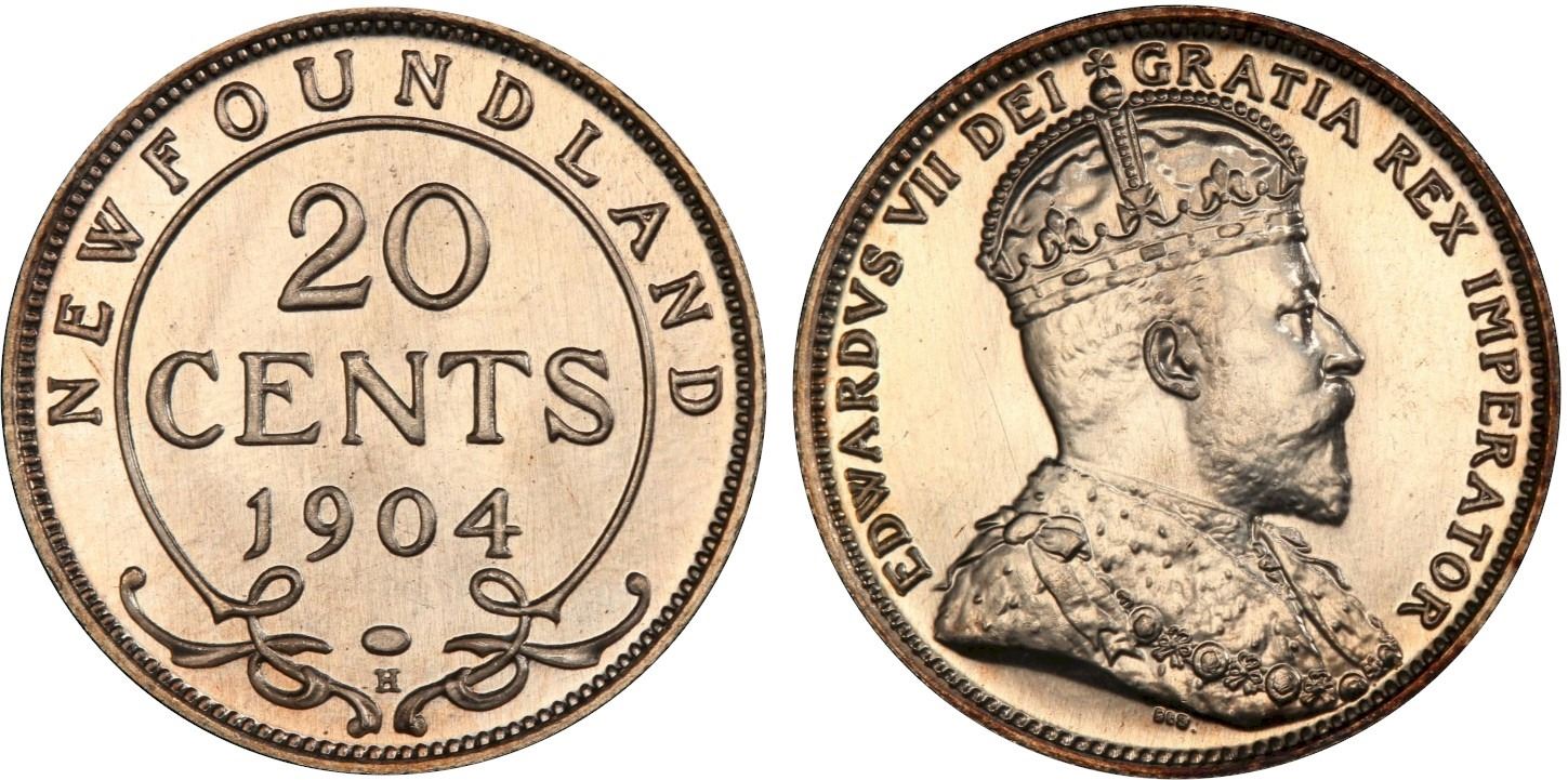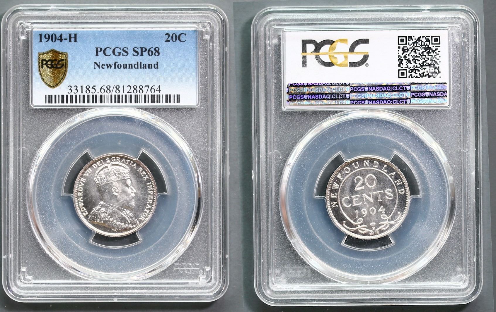 Nfld 1904H 20¢ PCGS Splendid SPECIMEN-68 Wow! Blast white with great reflective surfaces.  Another highly attractive and beautiful example to add to the best of collections. The coin lacks any fingerprints or major impairments, it displays untouched fields with thick cartwheel luster and great surfaces. Among the best we have offered and sure to excite the collector who has been holding out for the best example possible.