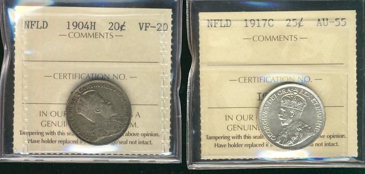 Nfld 1904H 20¢ VF20 & 1917c AU55. Lot of 2 coins both ICCS graded.