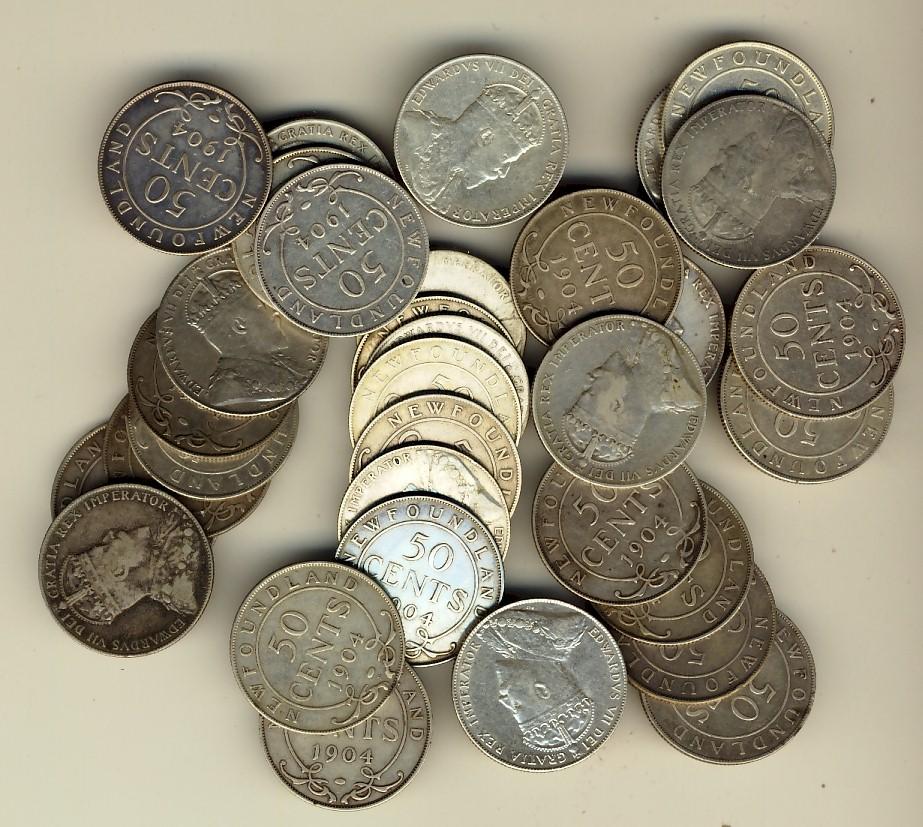 Nfld 1904H 50¢. Lot of 33 coins all Good to VF. Some with light cleaning. Should be viewed.