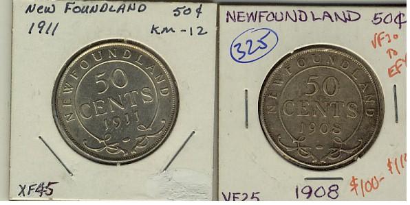 Nfld 1908, 1911 50¢, VF30 to EF40, 2 pieces.