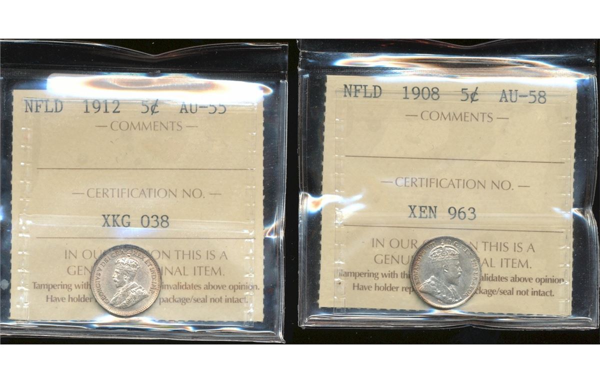 Nfld 1908 5¢ AU58 & 1912 AU55 with frosty gold lustre. Lot of 2 ICCS coins.