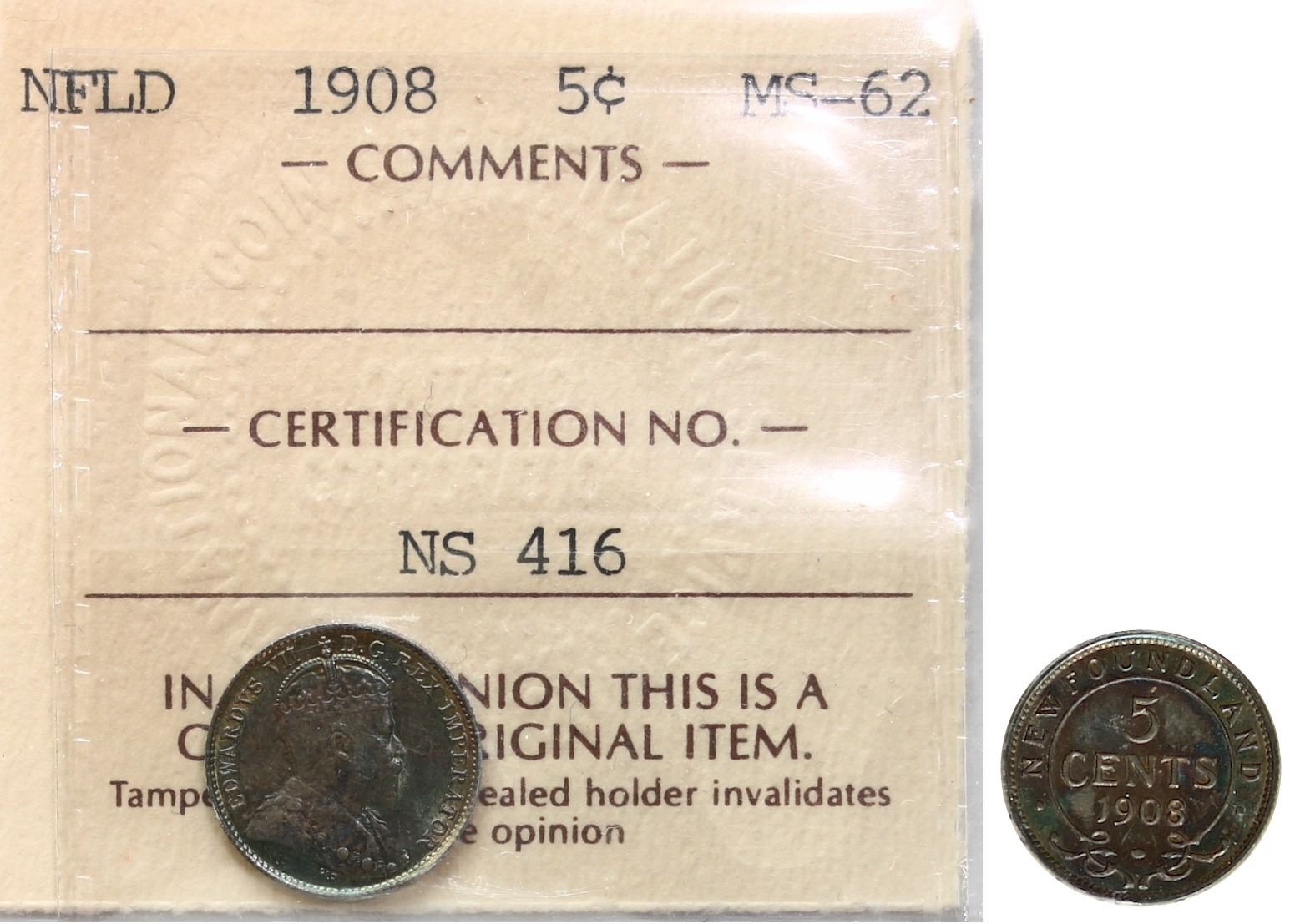 Nfld 1908 5¢ ICCS Choice Mint State-62 Superb green, blue and golden tones.