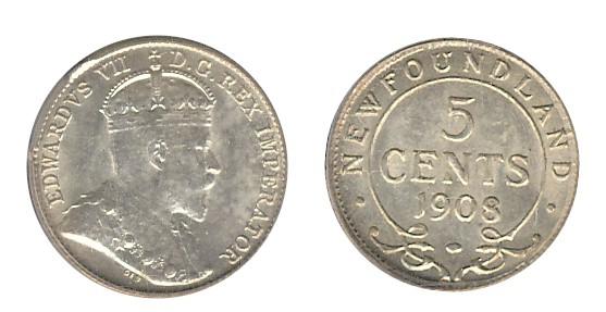 Nfld 1908 5¢ PCGS MS63. Lustrous example.