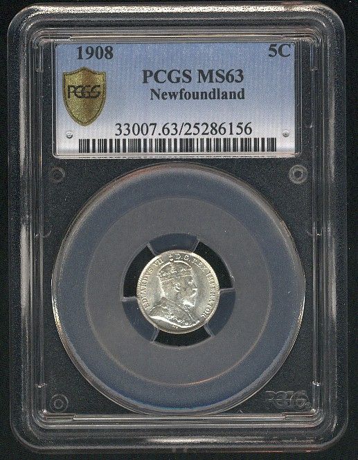 Nfld, 1908 5¢ PCGS MS63, fully brilliant and lustrous.