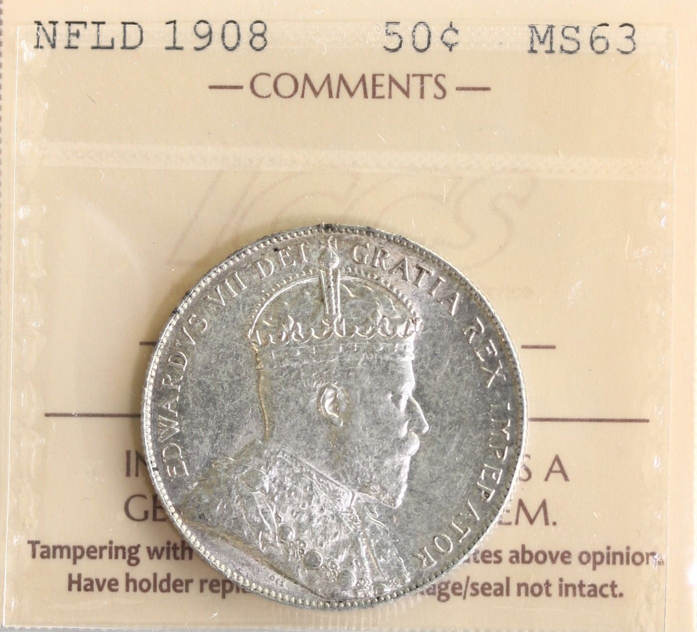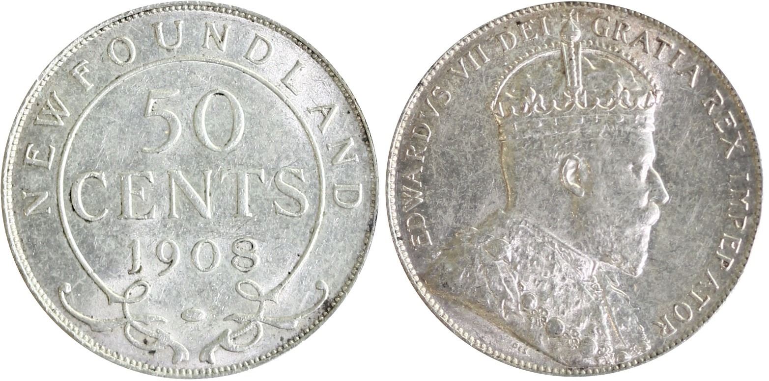 Nfld; 1908 50¢ ICCS Choice Mint State-63, Brilliant and lustrous.