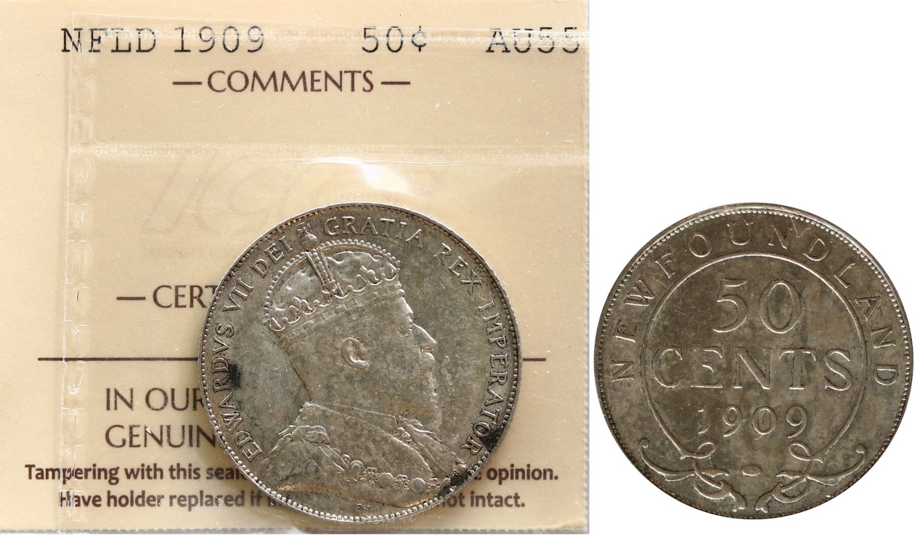 Nfld; 1909 50¢ ICCS Choice About Uncirculated-55 Lustrous,