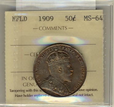 Nfld 1909 50¢ ICCS MS64. Intense gold toning.