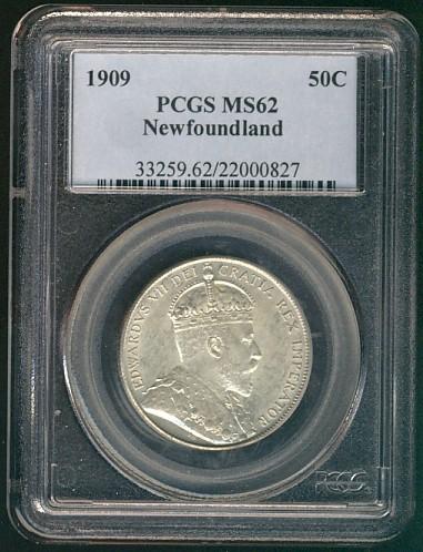 Nfld 1909 50¢ PCGS MS62. Very light tones with strong lustre.