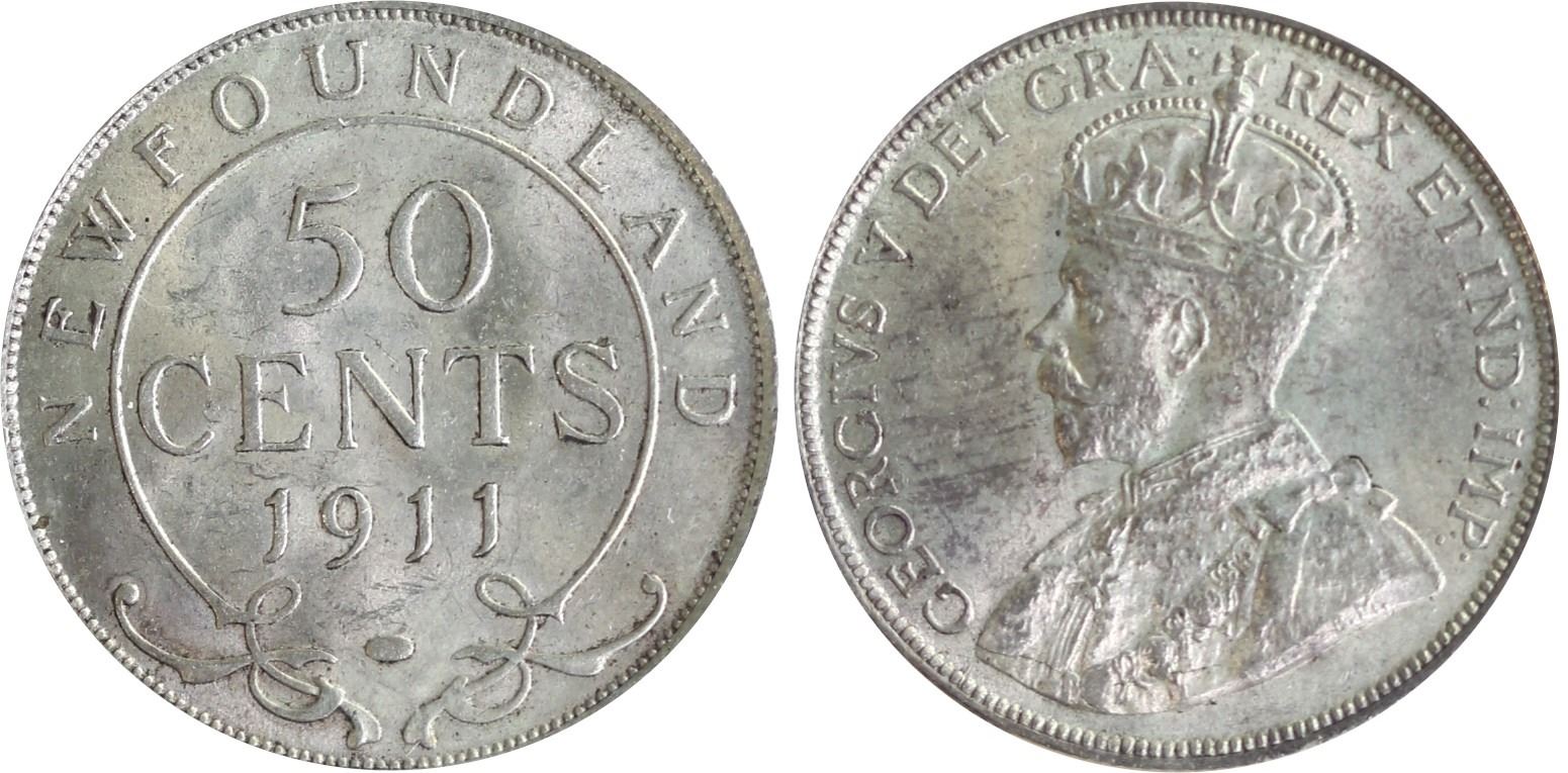 Nfld; 1911 50¢ ICCS Very Choice Mint State-64, lightly toned with full underlying lustre.