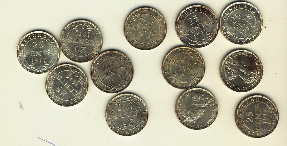 Nfld 1912 20¢, 1917c(6) & 1919c(5). Lot of 12 coins all VF or better.