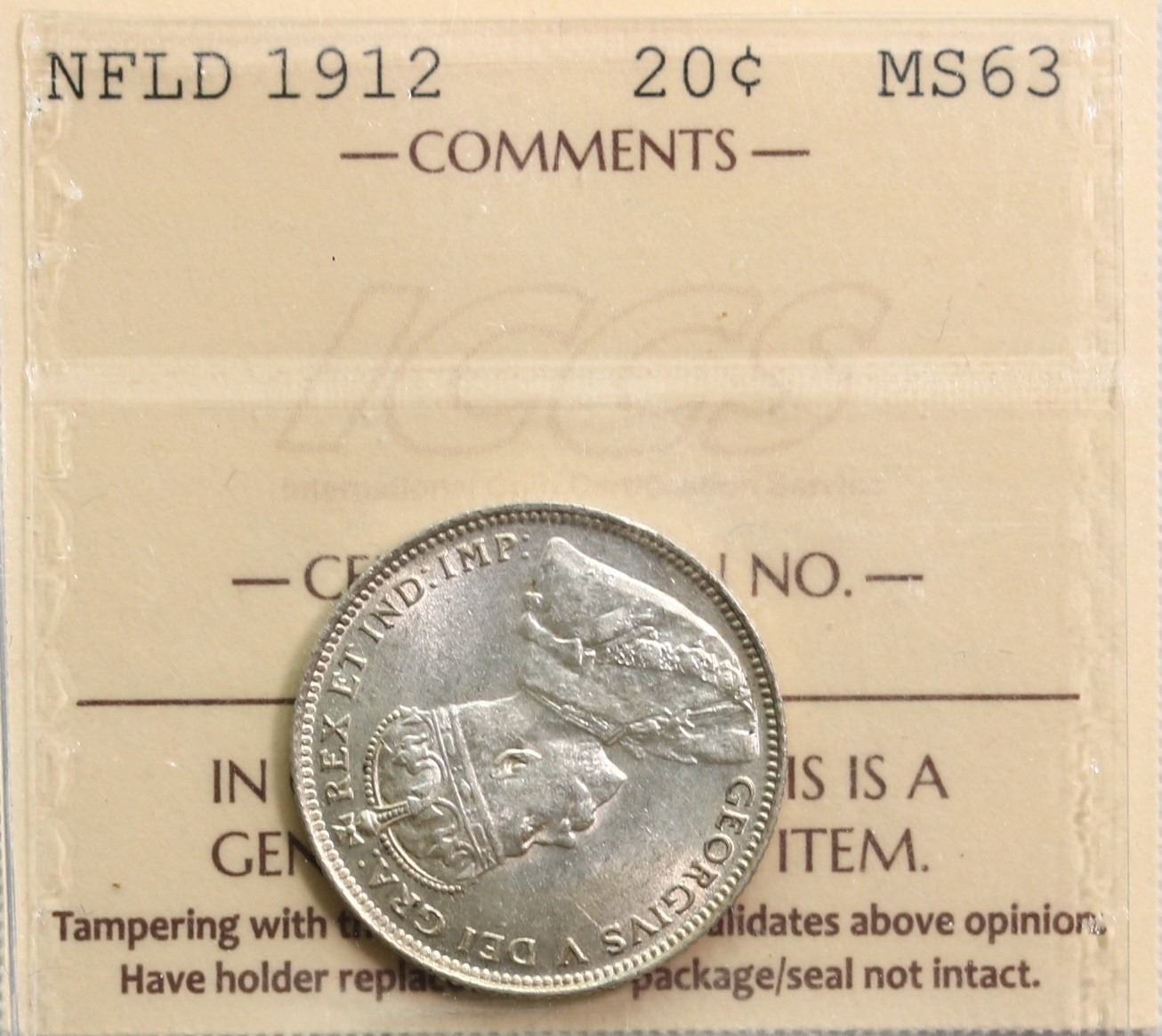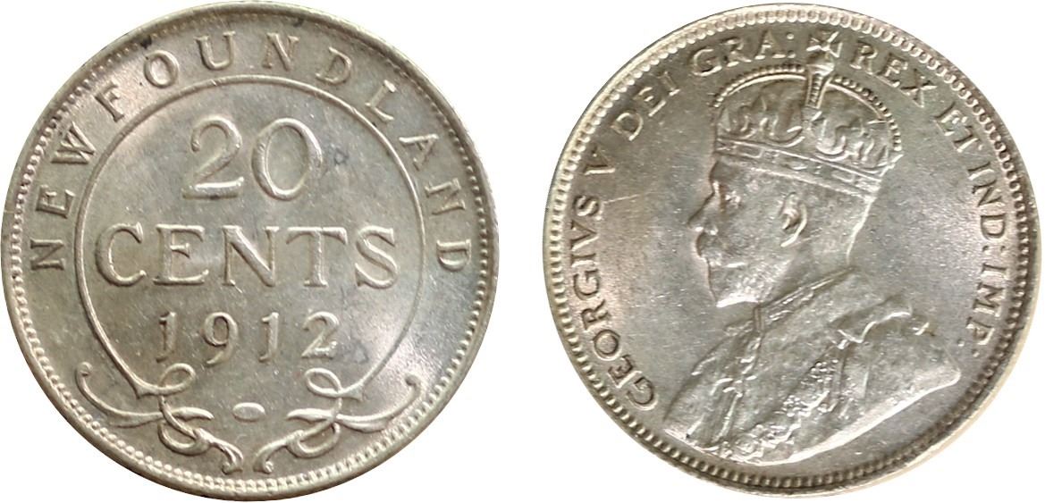 Nfld; 1912 20¢ ICCS Choice Mint State-63 Brilliant and lustrous with hint of gold.