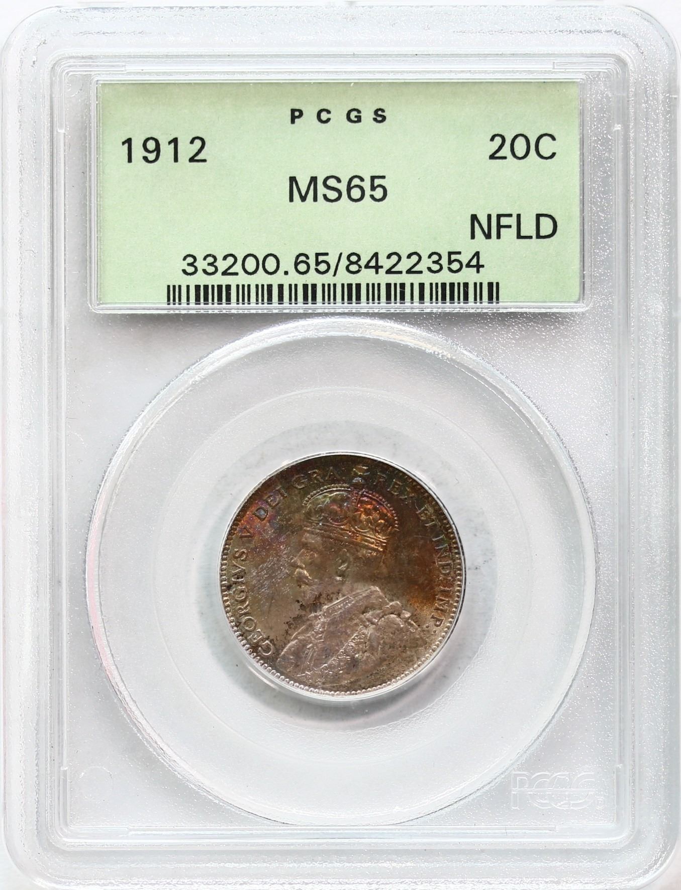 Nfld 1912 20¢ PCGS Gem Mint State-65 Attractive raibow tone over full underlying lustre.