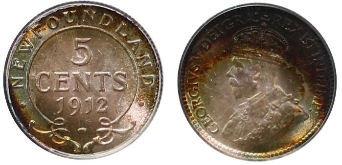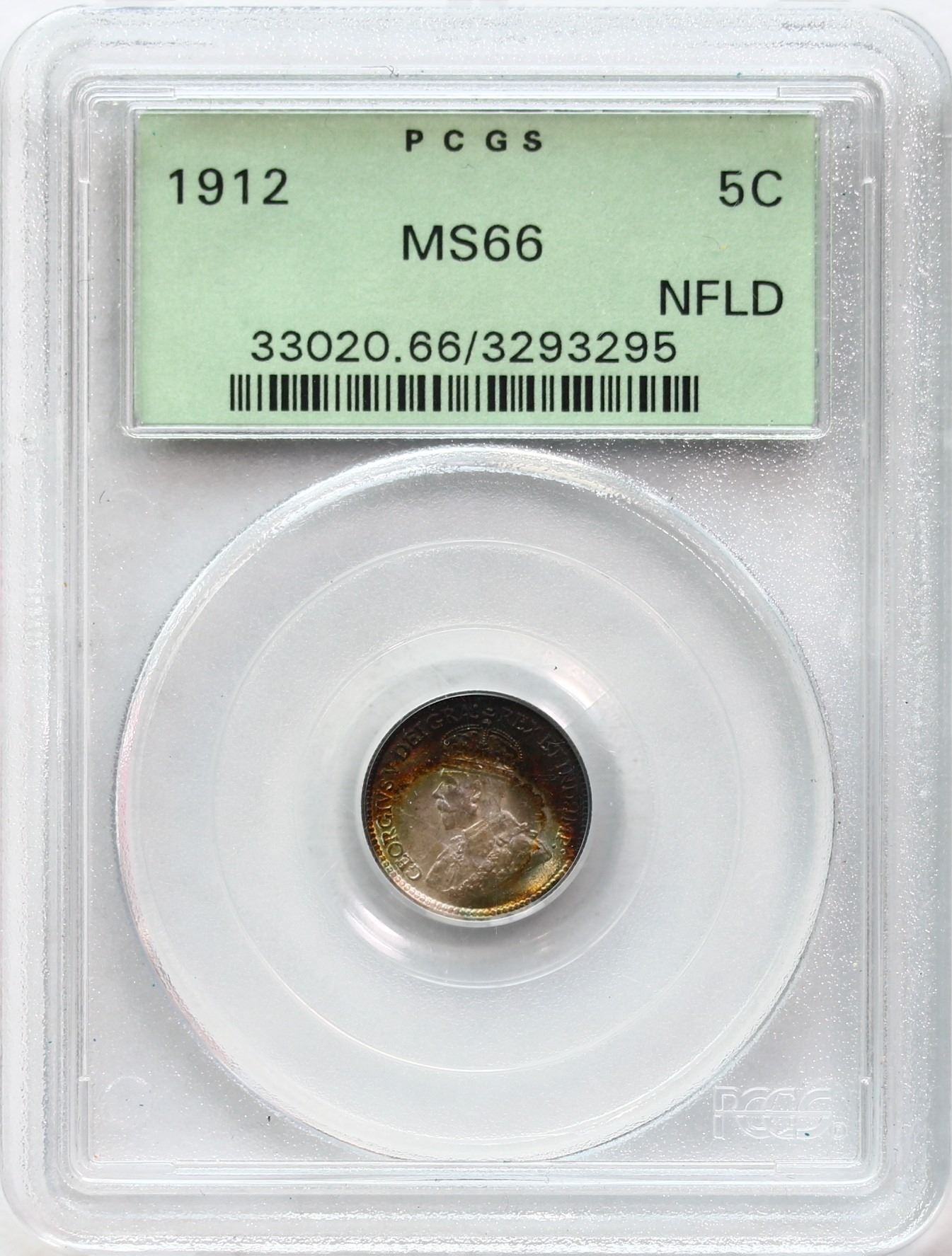 Nfld 1912 5¢ PCGS Superb Gem Mint State-66 Attractive raibow tone over full underlying lustre.