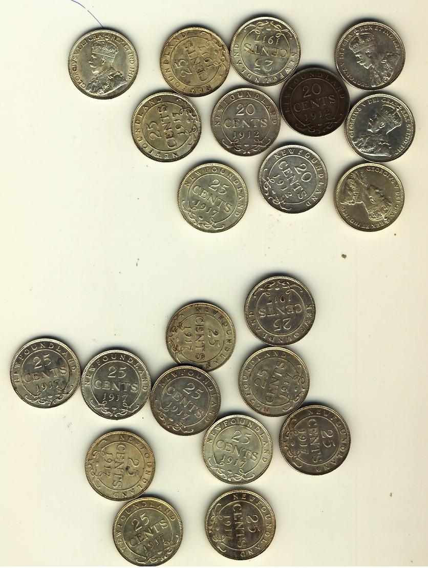 Nfld 1912(6) 20¢, 1917c(16) 25¢. Lot of 22 coins all VF or better.