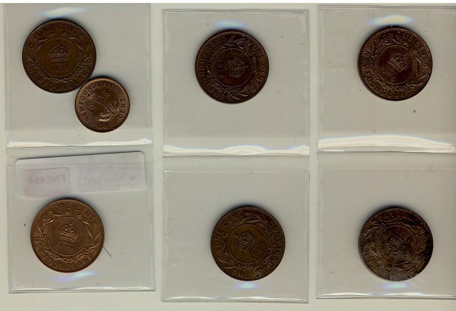 Nfld 1913 1¢, 1917c, 1929, 1936(3) & 1938. Lot of 7 coins all UNC to UNC63. Should be viewed.