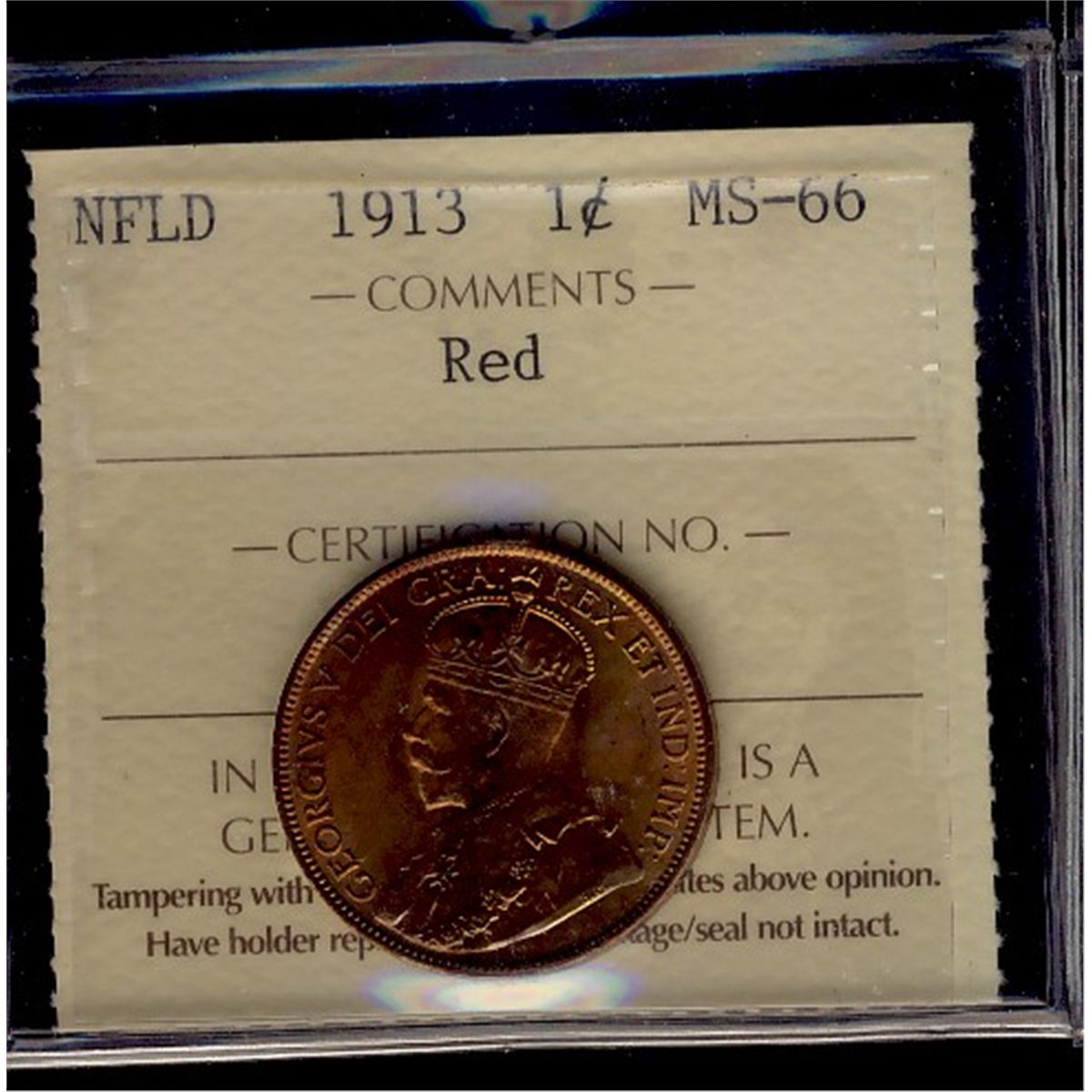 Nfld 1913 1¢ ICCS MS66. Lightly toned and full lustre.