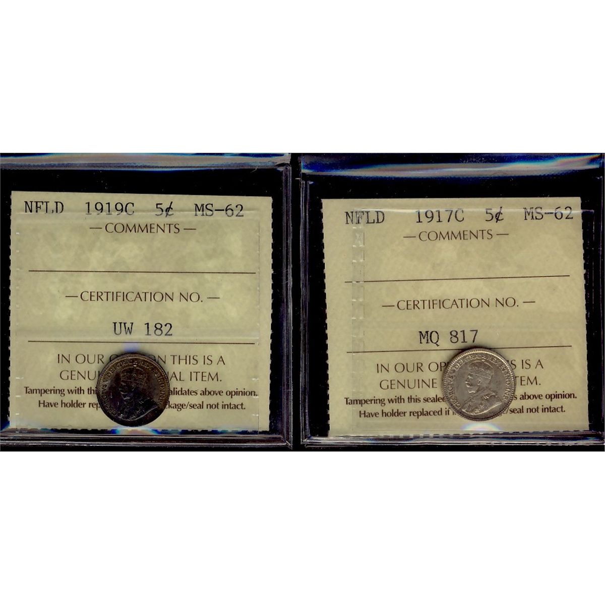 Nfld 1917c & 1919c 5¢ ICCS MS62. Lot of 2 scarce mintstate coins.