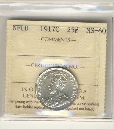 Nfld 1917c 25¢ ICCS MS60. Brilliant and lustrous.