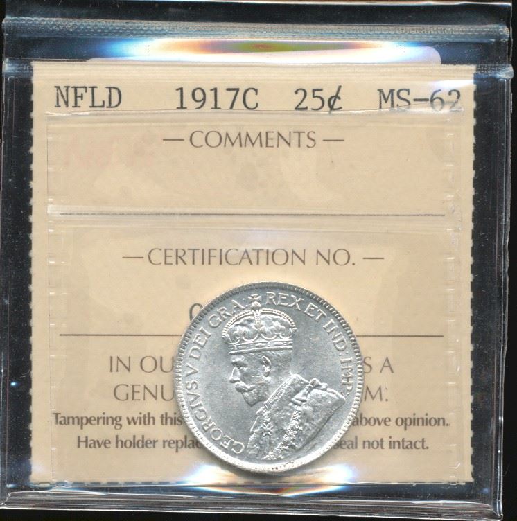 Nfld 1917c 25¢ ICCS MS62. Very heavy white frost. Est.