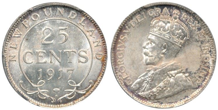 Nfld 1917c 25¢ PCGS MS64. Attractive scattered shades and crisp lustre.
