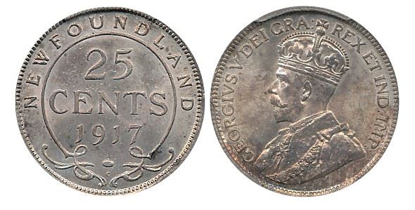 Nfld 1917c 25¢ PCGS MS64. Strong lustre under scattered golden tints.