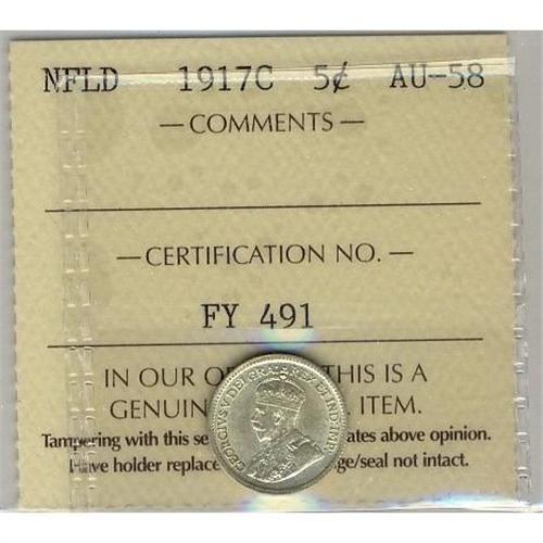 Nfld 1917c 5¢ ICCS AU58. Lots of lustre.