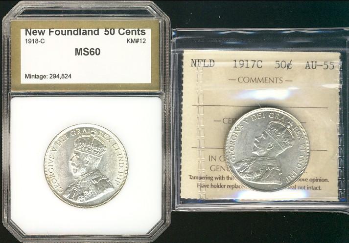 Nfld 1917c 50¢ ICCS AU55 & 1918c PCI MS60. Lot of 2 coins.