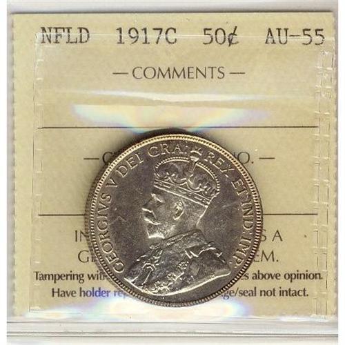Nfld 1917c 50¢ ICCS AU55. Light golden tone and lustrous.