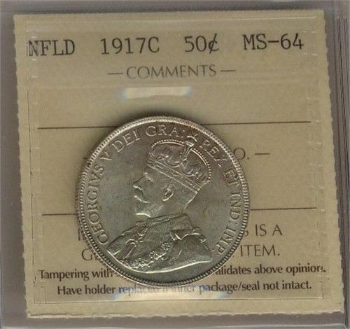 Nfld 1917c 50¢ ICCS MS64PQ+. Brilliant and lustrous,hint of toning. A very flashy coin. Scarce!