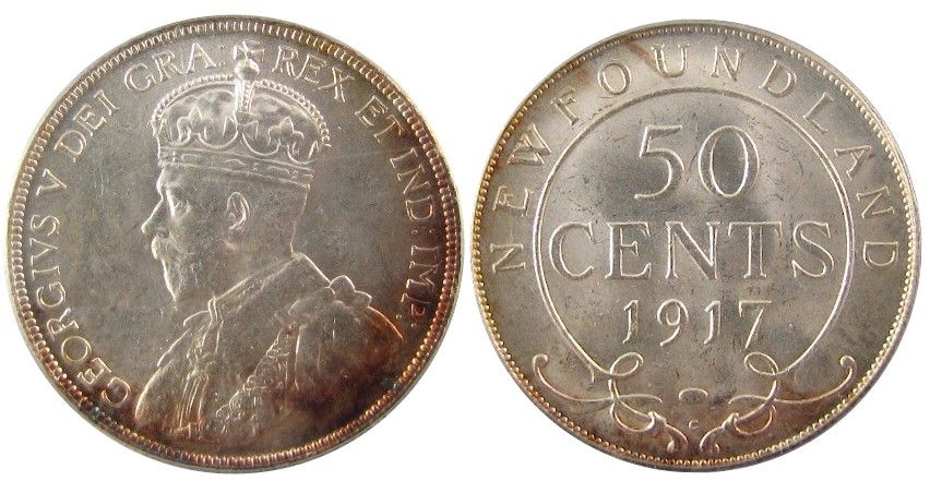 Nfld 1917c 50¢ PCGS MS63. Attractive frosted lustrous coin.