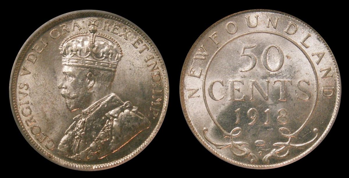 Nfld 1918c 50¢ PCGS MS-64, Touch of gold otherwise brilliant. Excellent strikes and clean fields