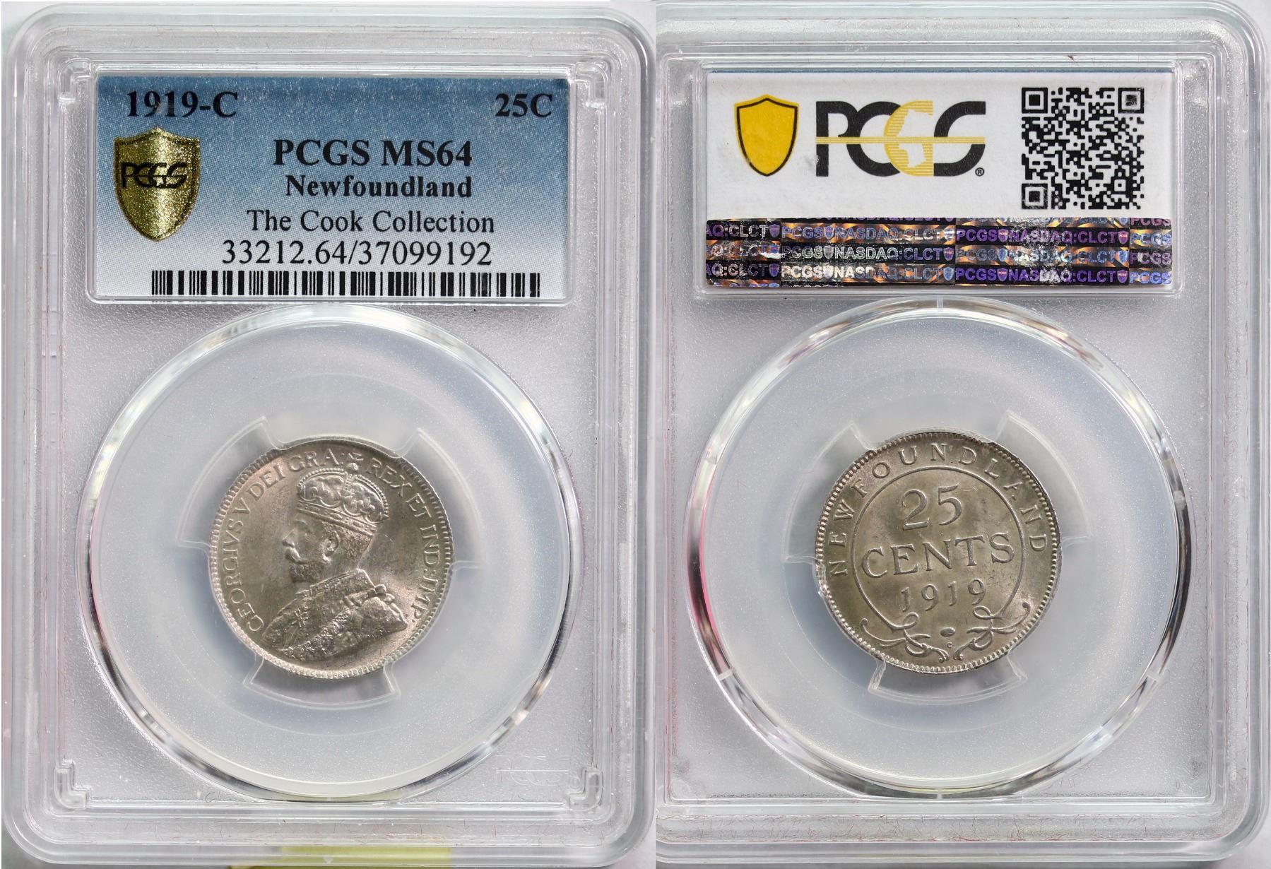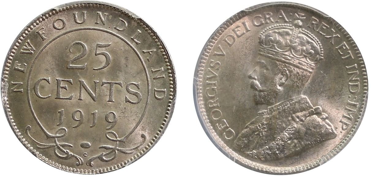 Nfld; 1919-C 25¢ PCGS Choice Mint State-64 Highly lustrous with just a touch of golden tone. An attractive example.