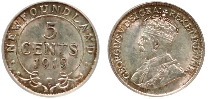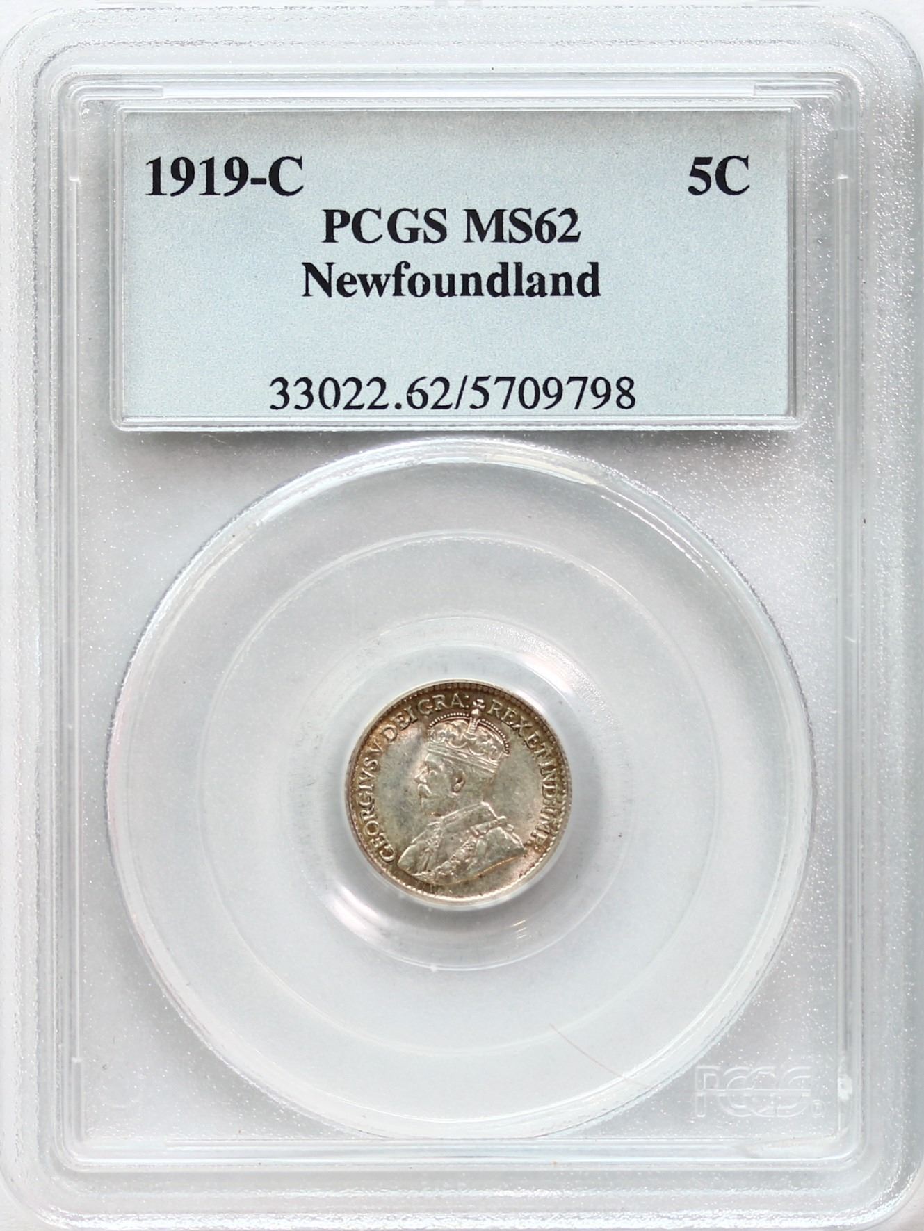 Nfld 1919-C 5¢ PCGS Choice Mint State-62 Brilliant and lustrous with just a hint of golden tone.
