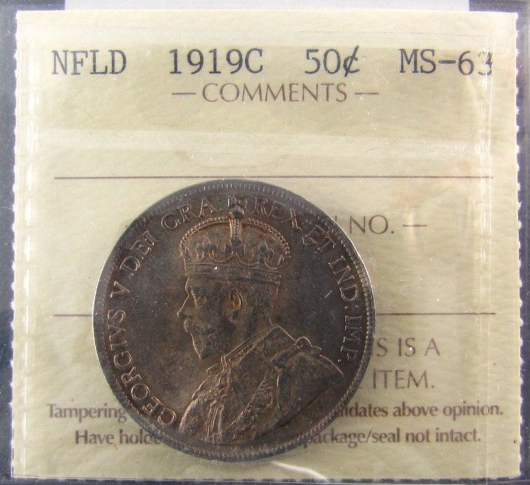 Nfld 1919C 50¢ ICCS MS63, Nice shades of gold, russet and green. A scarce date.