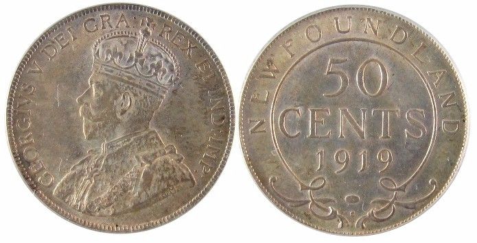 Nfld 1919C 50¢ PCGS MS64PQ. Light russet tone over full underlying lustre. Nice coin!