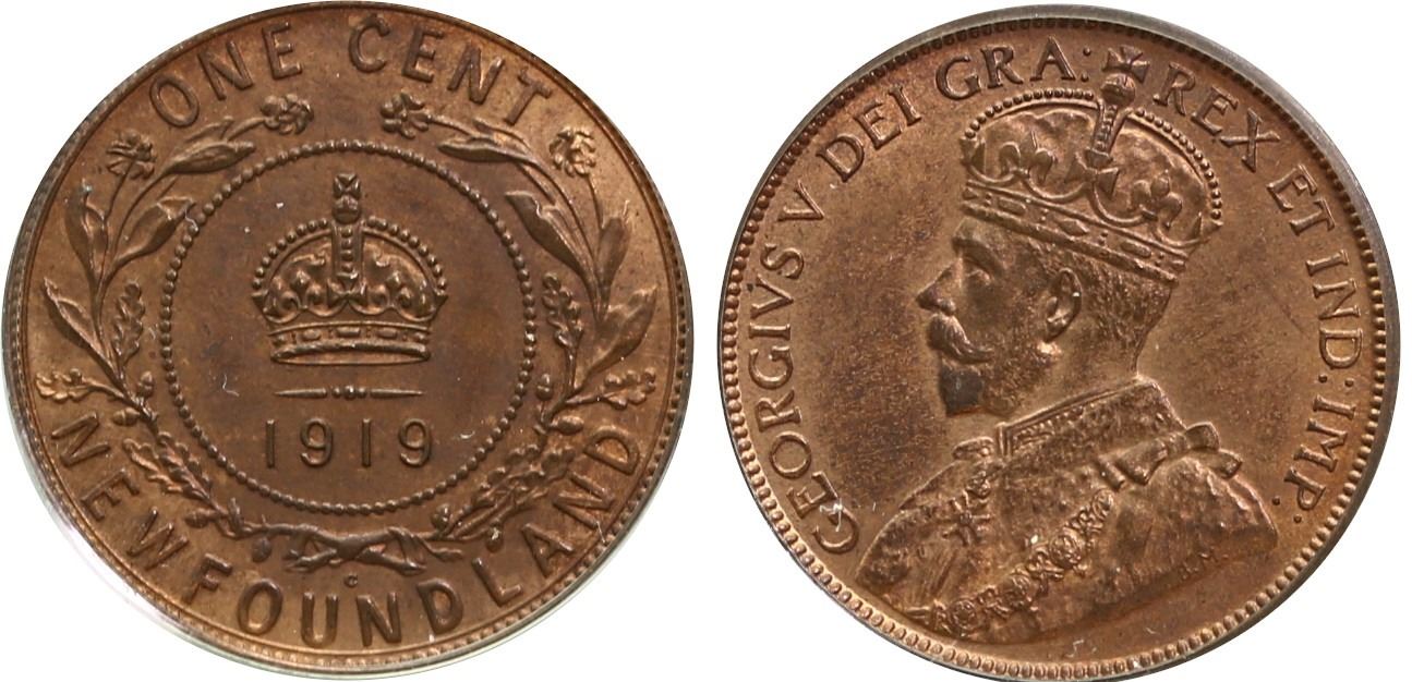 Nfld; 1919c 1¢ PCGS Gem Mint State-65 RB - 60% RED lustre. Lustrous and attractive issue. Seldom seen and offered in Gem condition.
