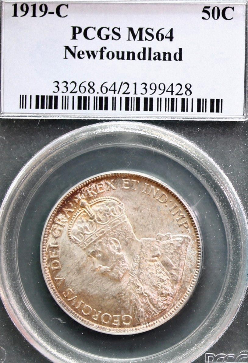 Nfld 1919c 50¢ PCGS Choice Mint State-64.  Decent lustre under sparse yellow and gold tints.