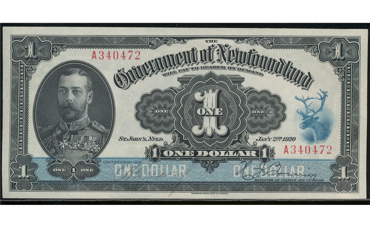Nfld; 1920 $1 NF-12d #A340472. A superb fully coloured and sharp AU/UNC issue with just a hint of handling on top right corner. Rarely seen in this high grade.