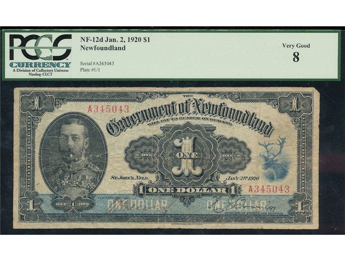 Nfld; 1920 $1 NF-12d #A345043, PCGS VG8.