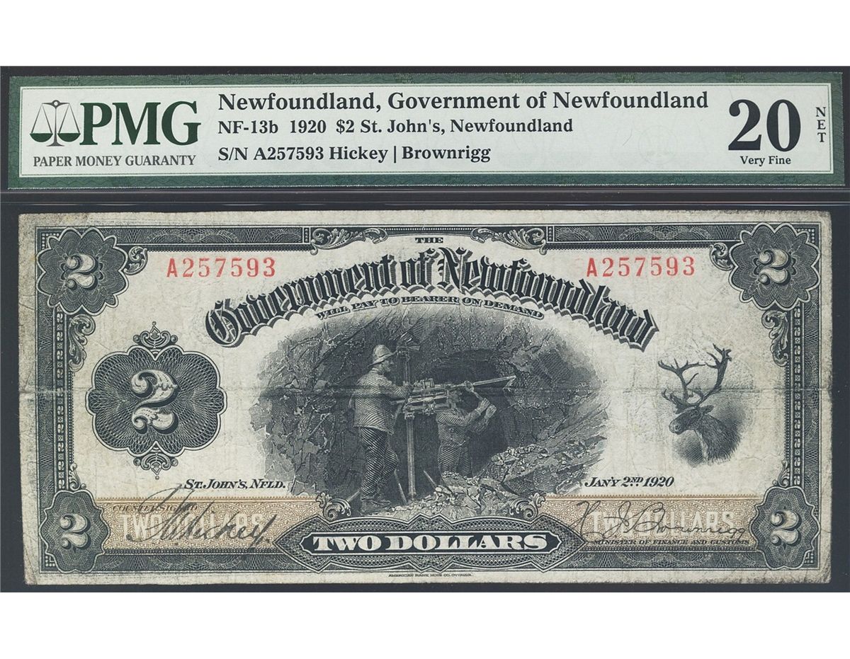 Nfld 1920 $2 NF-13b #A257593 PMG VF20 Net. Very clean and attractive on the face and lightly stained on the back. Minor splits not visible at naked eye. Overall a nice note.