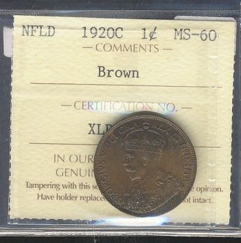 Nfld 1920C 1¢ ICCS MS-60 Brown.
