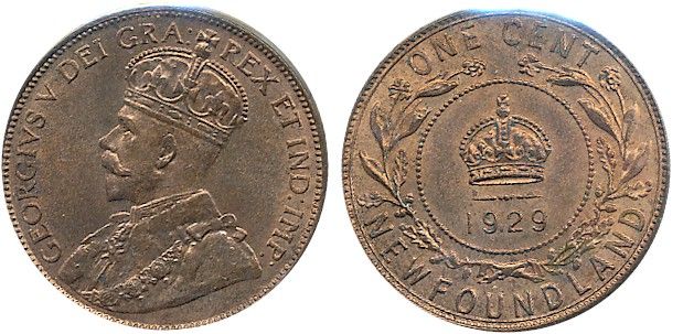 Nfld 1929 1¢ ICCS MS65RD. 85% red and lustrous.