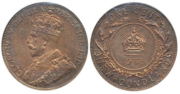 Nfld 1936 1¢ ICCS MS64RD. Nice 90% red with lustre.