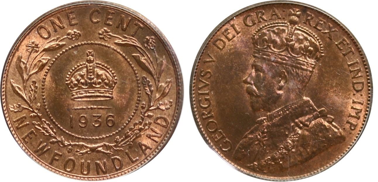 Nfld; 1936 1¢ PCGS Superb Gem Mint State-66 RB - 75% RED lustre. Lustrous and attractive issue.