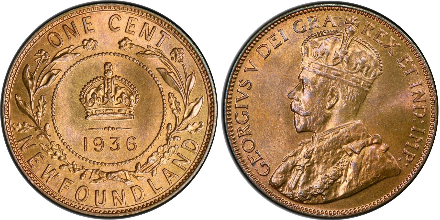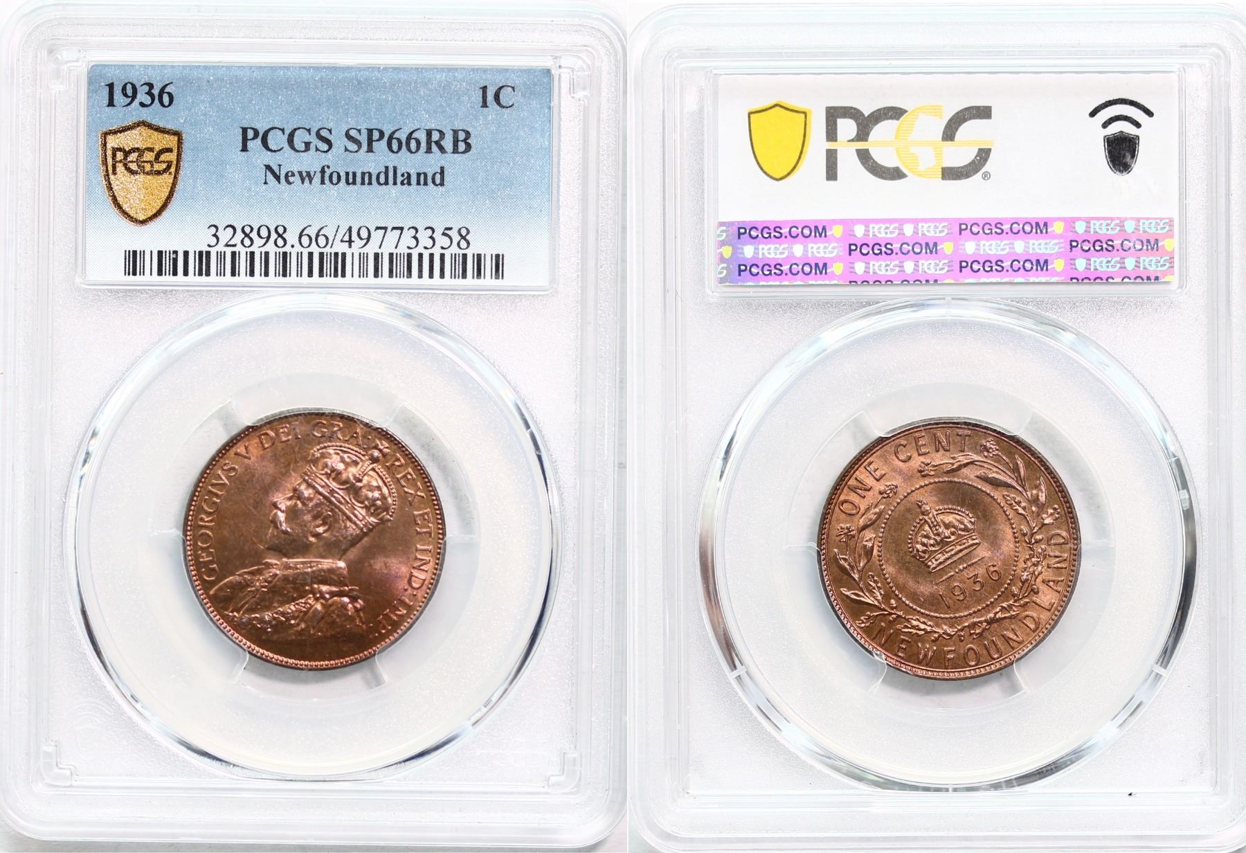 Nfld 1936 1¢ PCGS Superb Gem SPECIMEN-66RB 90% RED. Full mirror appeal with displaying gem red colours. Among the best we have offered and sure to excite the collector who has been holding out for the best possible example.