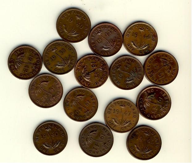 Nfld 1938 1¢, 1940(4), 1941c, 1942(2), 1943c, 1944c(3) & 1947c(3). Lot of 15 coins all EF or better. Should be viewed.