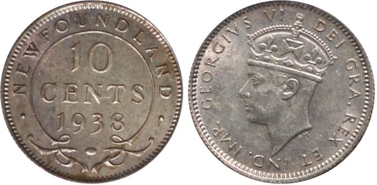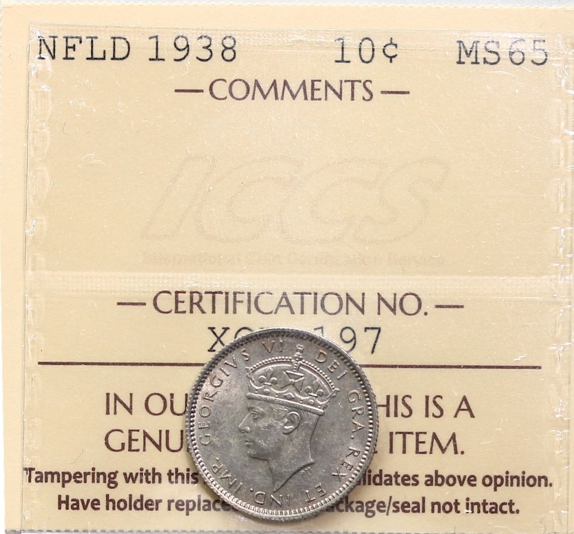Nfld 1938 10¢ ICCS Gem Mint State-65 Delicate tonin over full underlying lustre. Great surfaces. Very scarce.