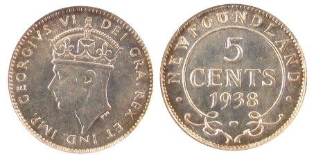 Nfld 1938 5¢ PCGS MS64. Brilliant with hint of gold rim tone.
