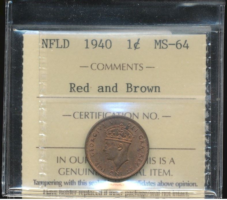 Nfld 1940 1¢ ICCS MS64RB. Lustrous issue, difficult for grade.