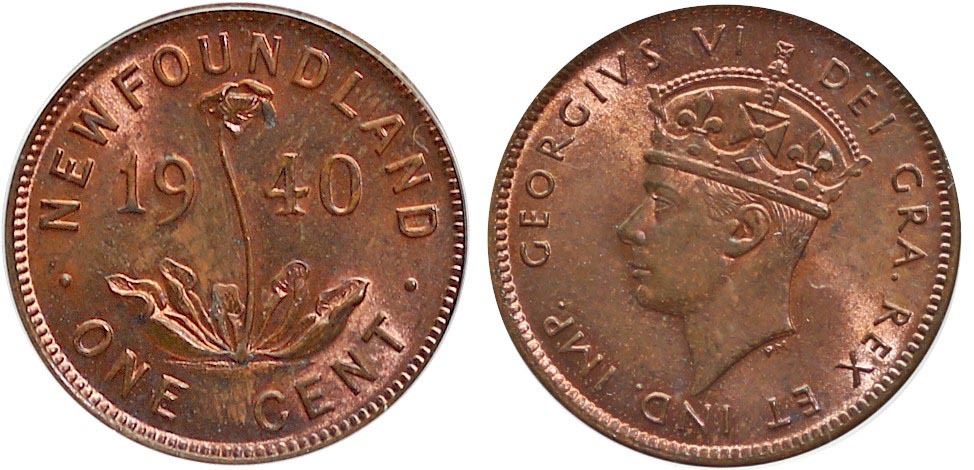 Nfld; 1940 1¢ PCGS Very Choice Mint State-64 RB - 75% RED lustre. Lustrous and attractive issue. Very scarce date to find.